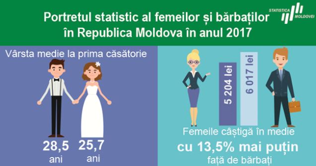 On the occasion of the International Women's Day, the National Bureau of Statistics publishes the Women's and Men's Statistical Portrait in the Republic of Moldova. The main findings show that women live longer than men, get married earlier and have a higher level of training than men. On the other hand, men have a higher employment rate, gain more and predominate at the decision-making level.