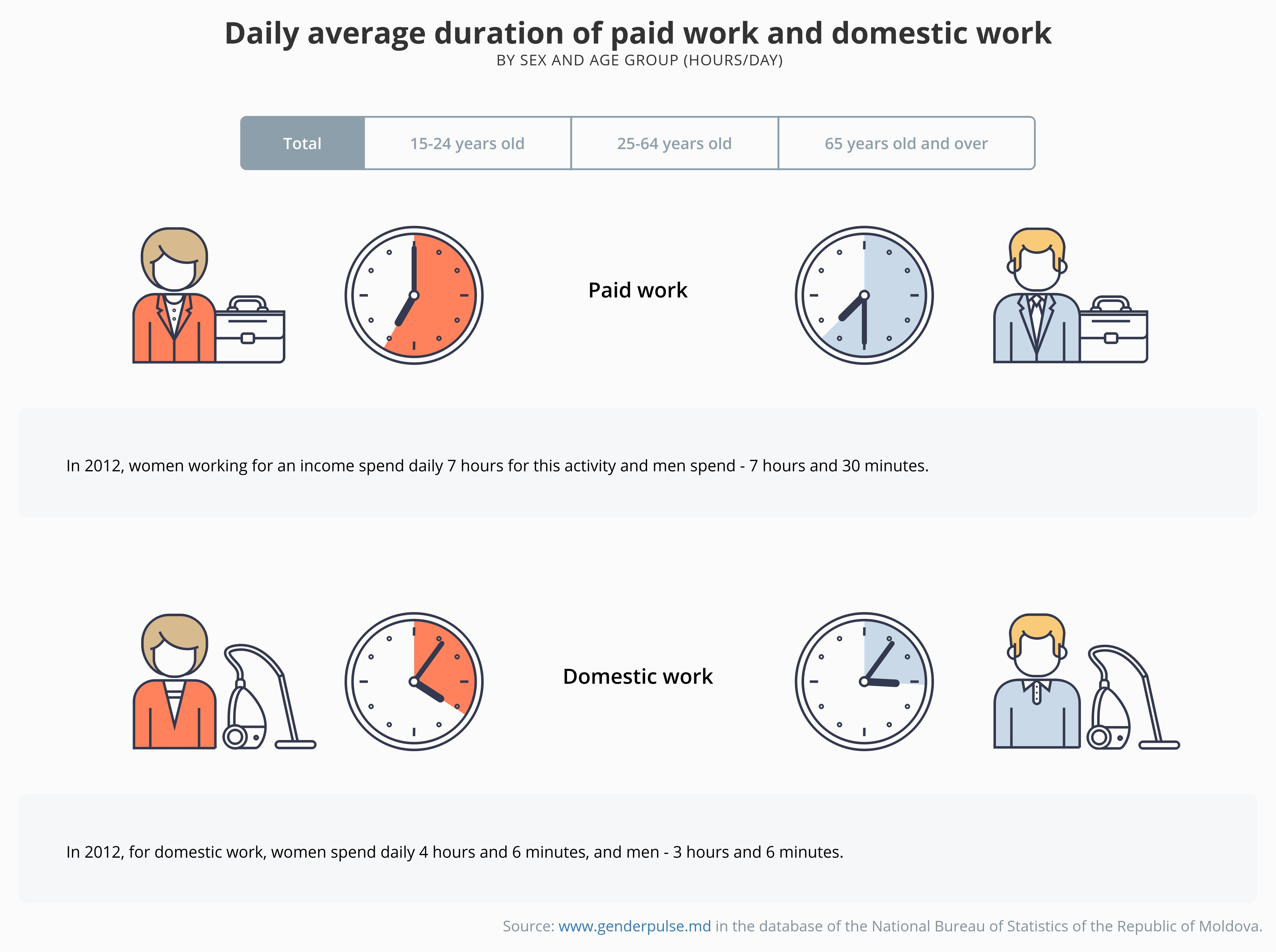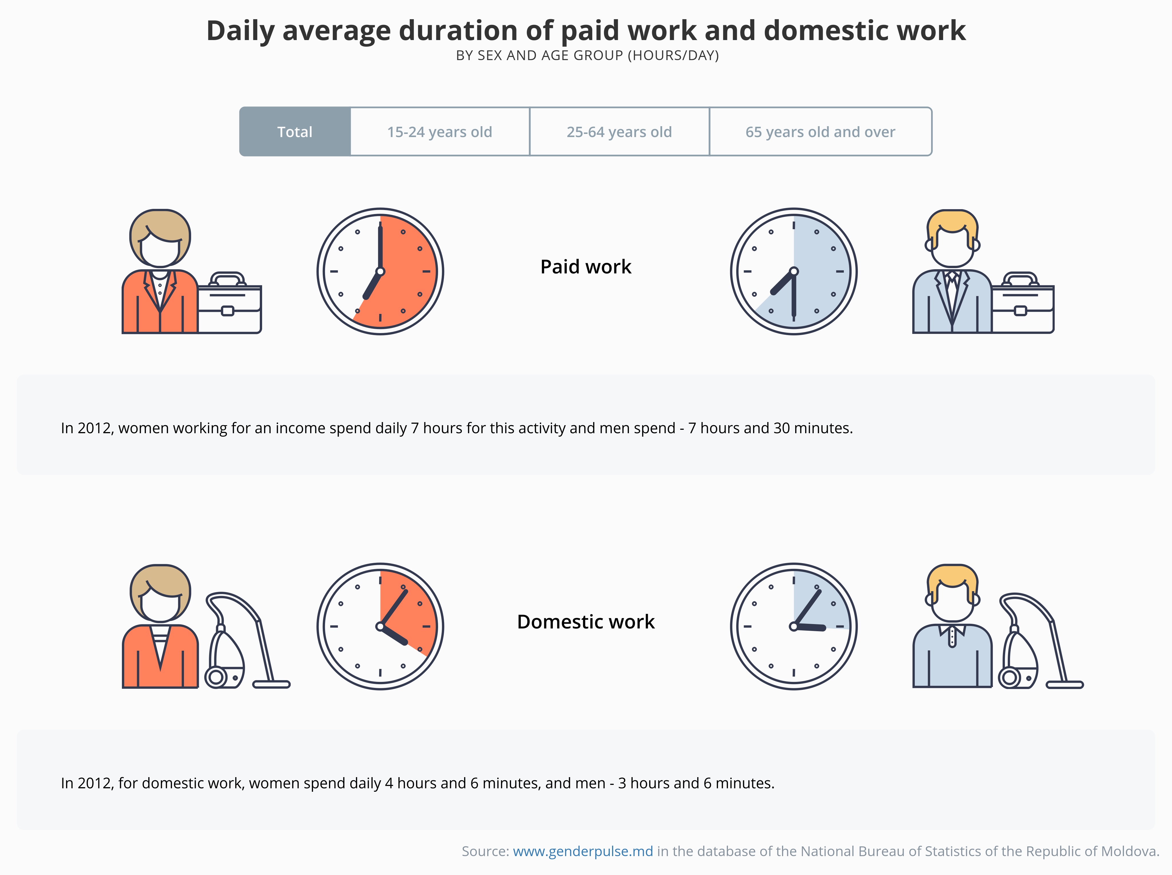 Daily average duration of paid work and domestic workby sex and age group (hours/day)