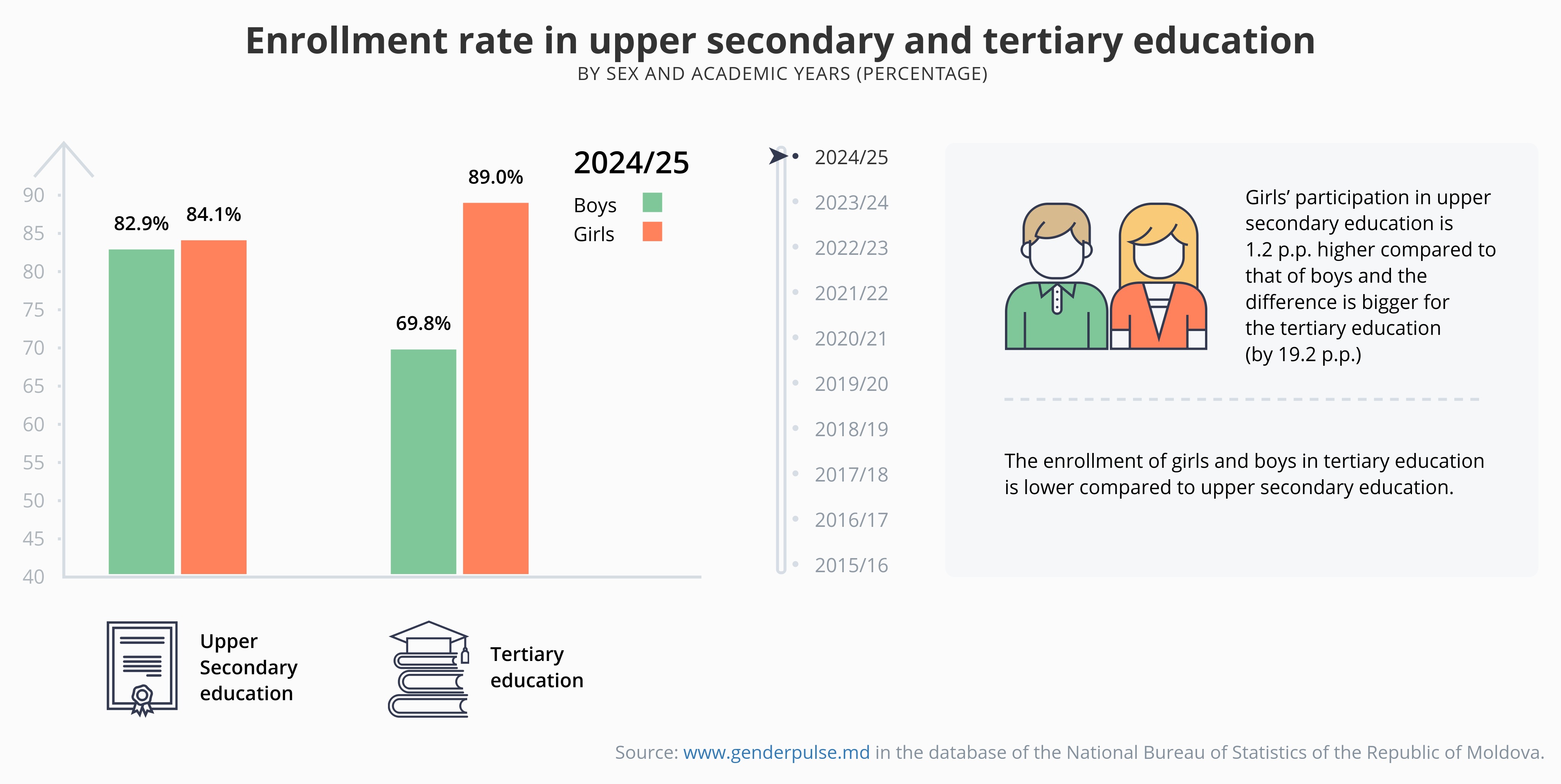 Enrollment rate in upper secondary and tertiary educationby sex and academic years (percentage)