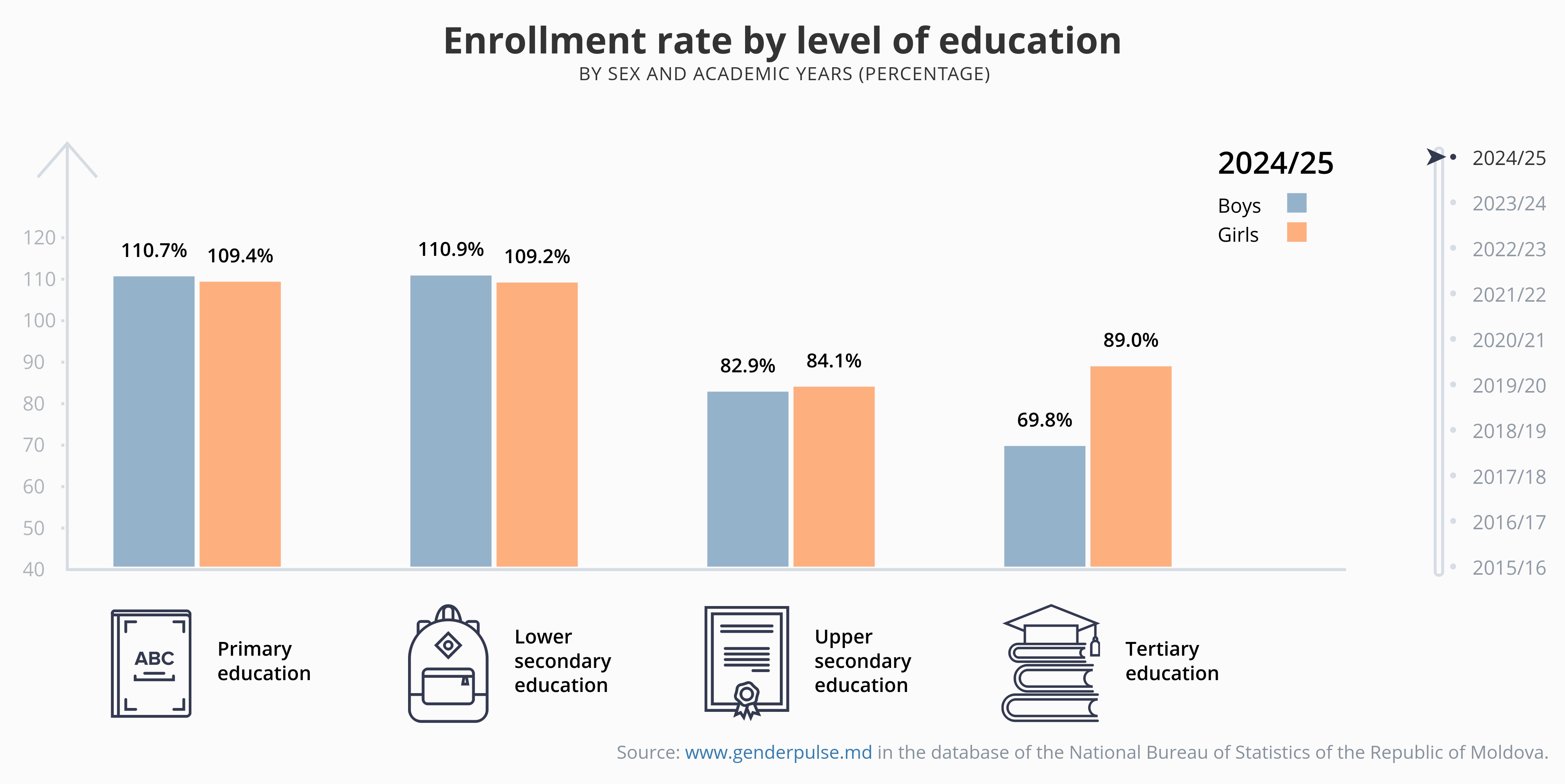 Enrollment rate in primary and lower secondary educationby sex and academic years (percentage)
