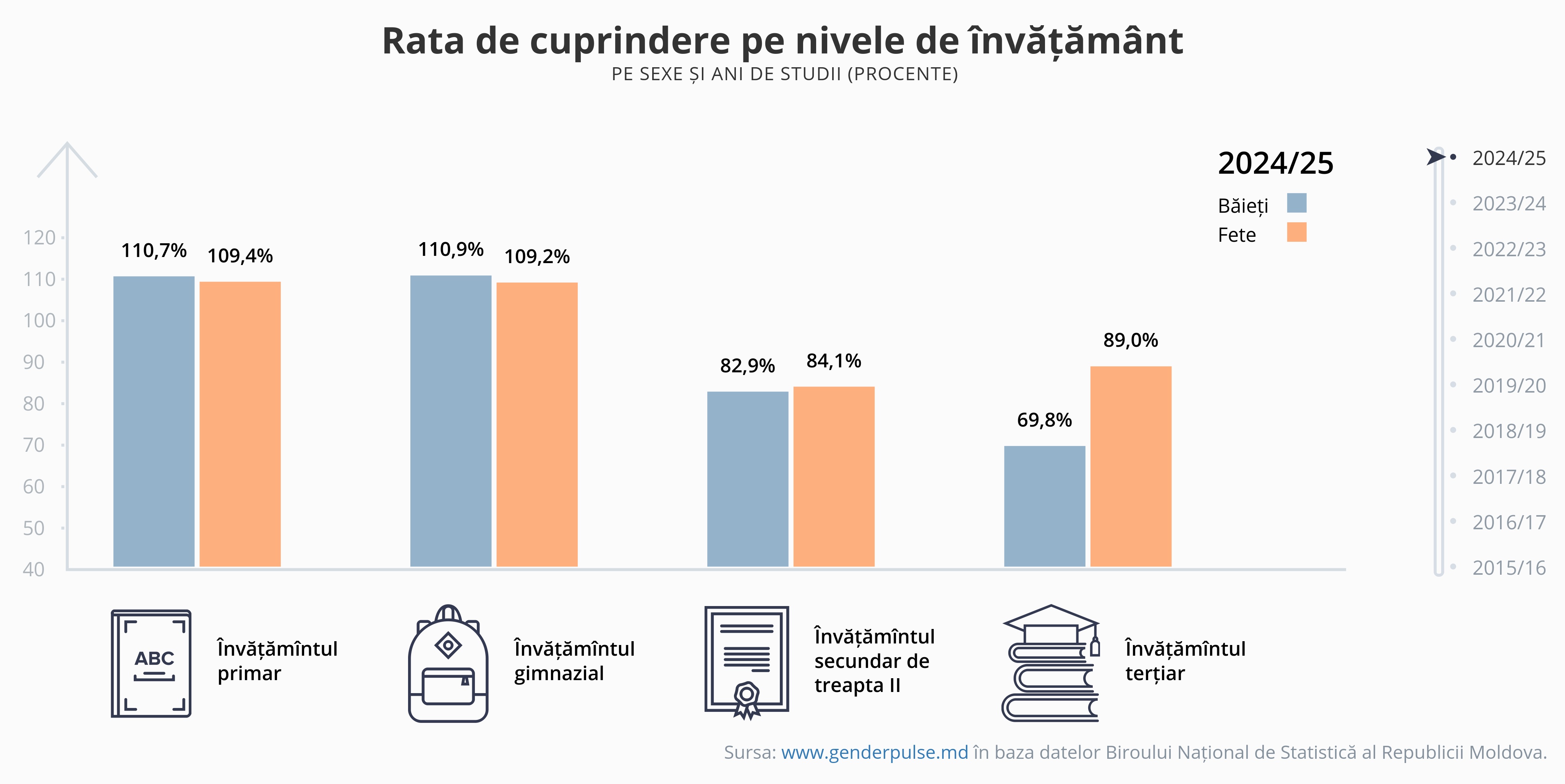Rata de cuprindere pe nivele de învățământpe sexe și ani de studii (procente)