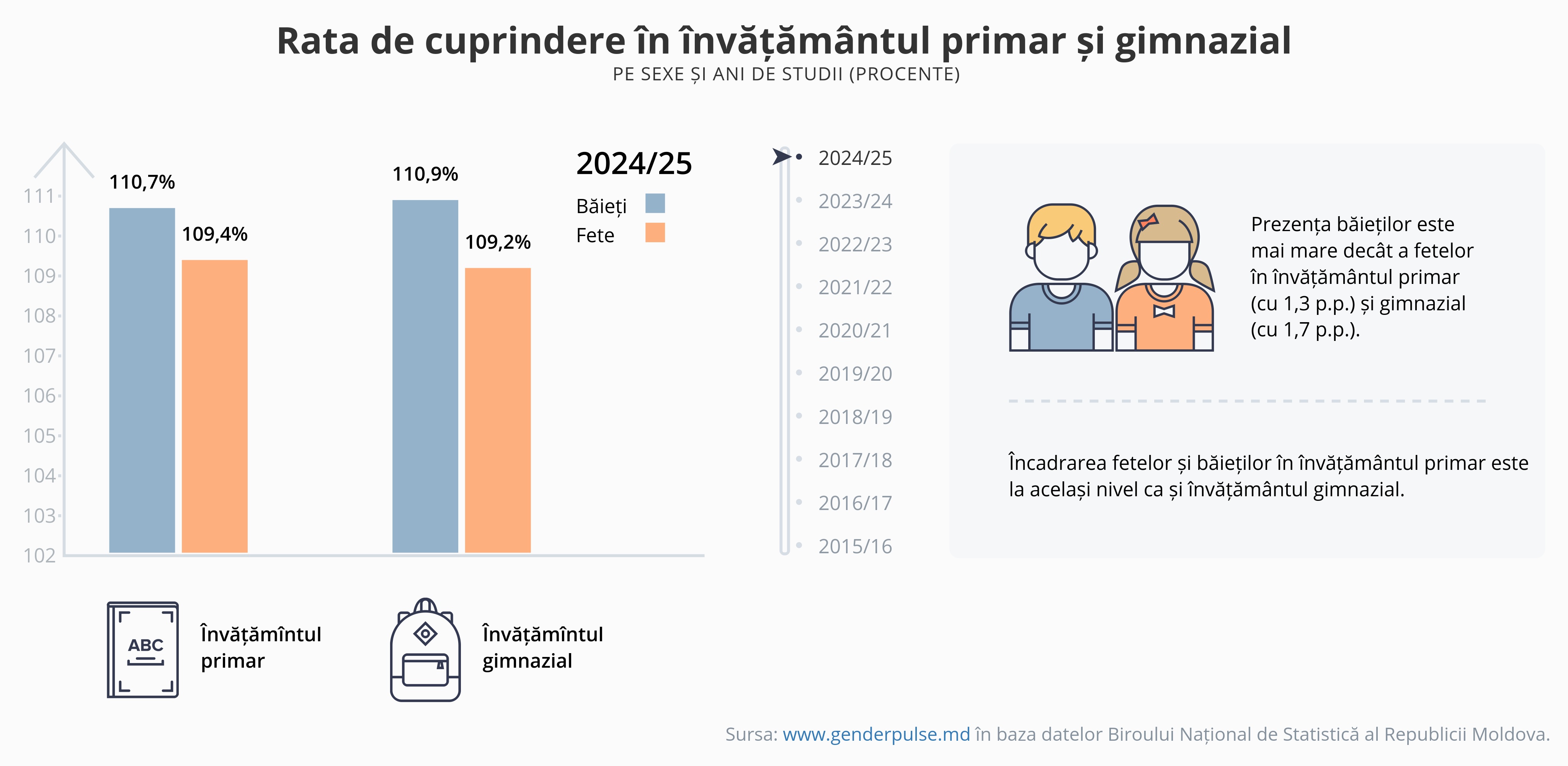 Rata de cuprindere în învățământul primar și gimnazialpe sexe și ani de studii (procente)