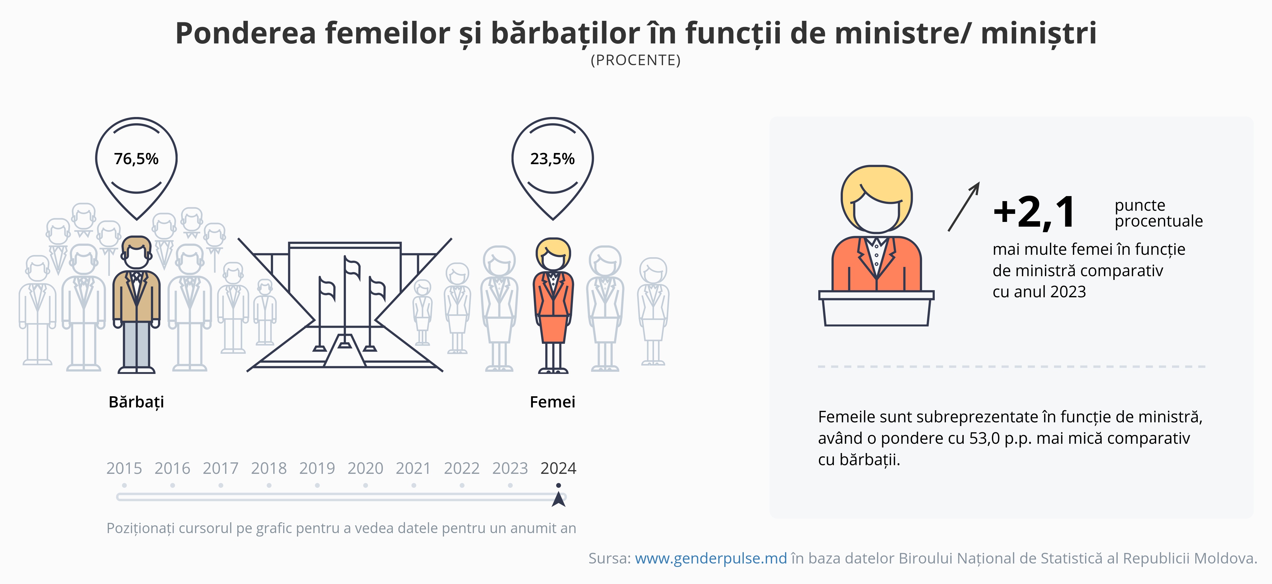 Ponderea femeilor și bărbaților în funcții de ministre/ miniștri(procente)