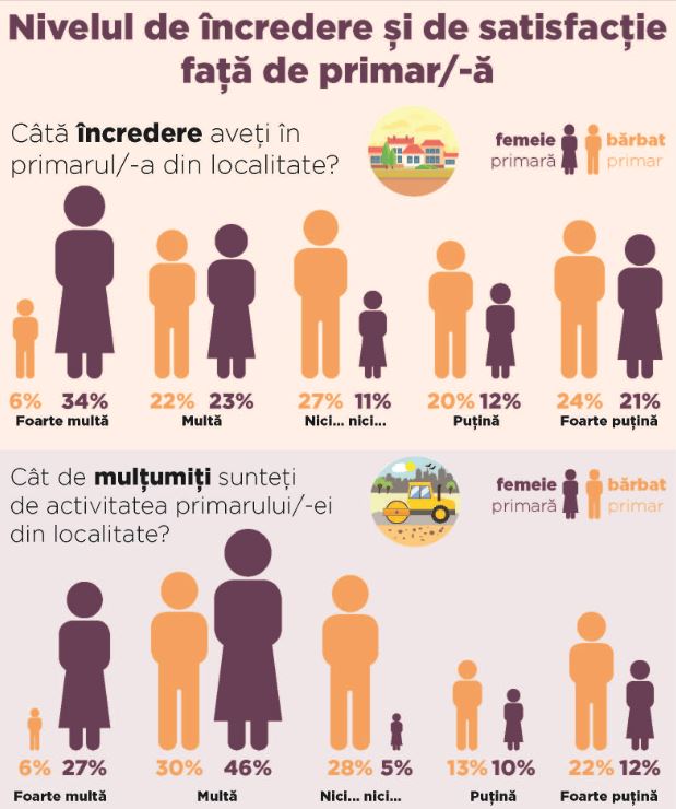 În cazul comunităților cu femeie în funcție de primar, nivelul încrederii este de 34%, comparativ cu 6% în cazul comunităților în care primarul este bărbat, iar rata de implicare a cetăţenilor în elaborarea proiectelor comunitare în localităţile conduse de bărbaţi a fost de 4,6% pe când cea în comunităţile conduse de femei era de 9,6%.