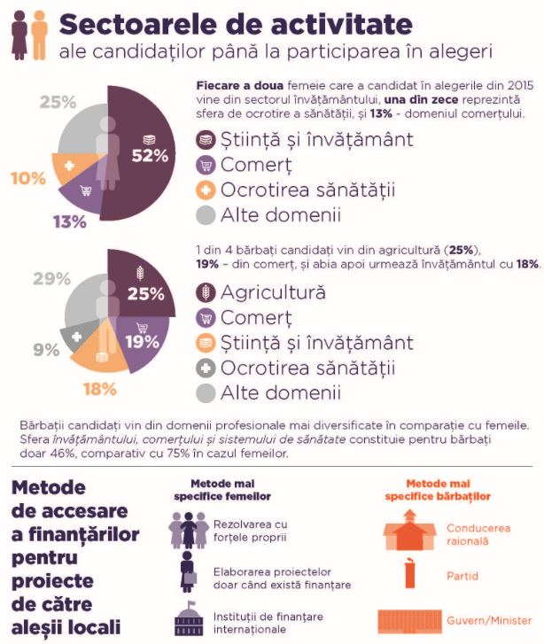 Cu cât funcția politică este mai importantă, cu atât crește preferința respondenților pentru un bărbat. Aproximativ 10,8% din respondenți afirmă că pentru funcția de președinte al Comitetului de părinți la școală ar prefera un bărbat (31,6% ar opta pentru o femeie). În funcția de director de școală, 17,8% respondenţi ar da întâietate unui bărbat, iar 23,5% – unei femei. Funcția de primar este asociată preponderent cu genul masculin (33,2% optează pentru un bărbat și doar 11,7% ar accepta o femeie). Cel mai mare decalaj a înregistrat opţiunea pentru funcţia de președinte al țării – 40,5% din respondenţi ar prefera un bărbat în fruntea statului și doar 7,6% – o femeie. Fiecare a doua femeie care a candidat în alegerile din anul 2015 vine din sectorul învățământului, una din zece reprezintă sfera de ocrotire a sănătății și 13% – domeniul comerțului. În cazul bărbaților candidați, această concentrare pe domenii este mai puțin pronunțată – 25% dintre ei vin din sectorul agricol, 19% din comerț și doar 18% din sectorul educației.