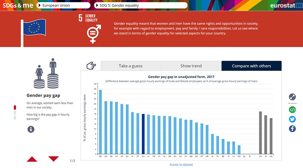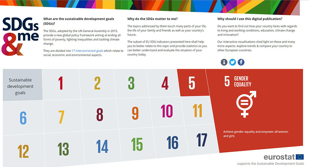 Publicația digitală "SDGs & me" a fost creată de Eurostat și are ca scop să ajute toți cetățenii interesați să exploreze Obiectivele de dezvoltare durabilă (ODD) în contextul UE. Cele 17 Obiective de Dezvoltare Durabilă, inclusiv Obiectivul 5 privind egalitatea de gen, sunt prezentate inovativ utilizînd instrumente de vizualizare ușor de înțeles pentru un sub-set selectat al celor 100 de indicatori ODD ai UE.
