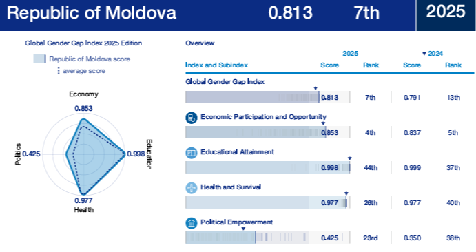 Raportul arată că Moldova a redus 81,3% din decalajul său general de gen, înregistrând o creștere a scorului cu +0,023 puncte față de anul 2024. Cea mai importantă îmbunătățire față de ediția anterioară este în domeniul împuternicirii politice, unde Moldova a câștigat +7,5 puncte procentuale, atingând un scor de 42,5% în 2025. De la publicarea pentru prima dată a indicelui în 2006, Moldova și-a triplat scorul în această categorie, datorită creșterii reprezentării femeilor în poziții de conducere politică și de luare a deciziilor.