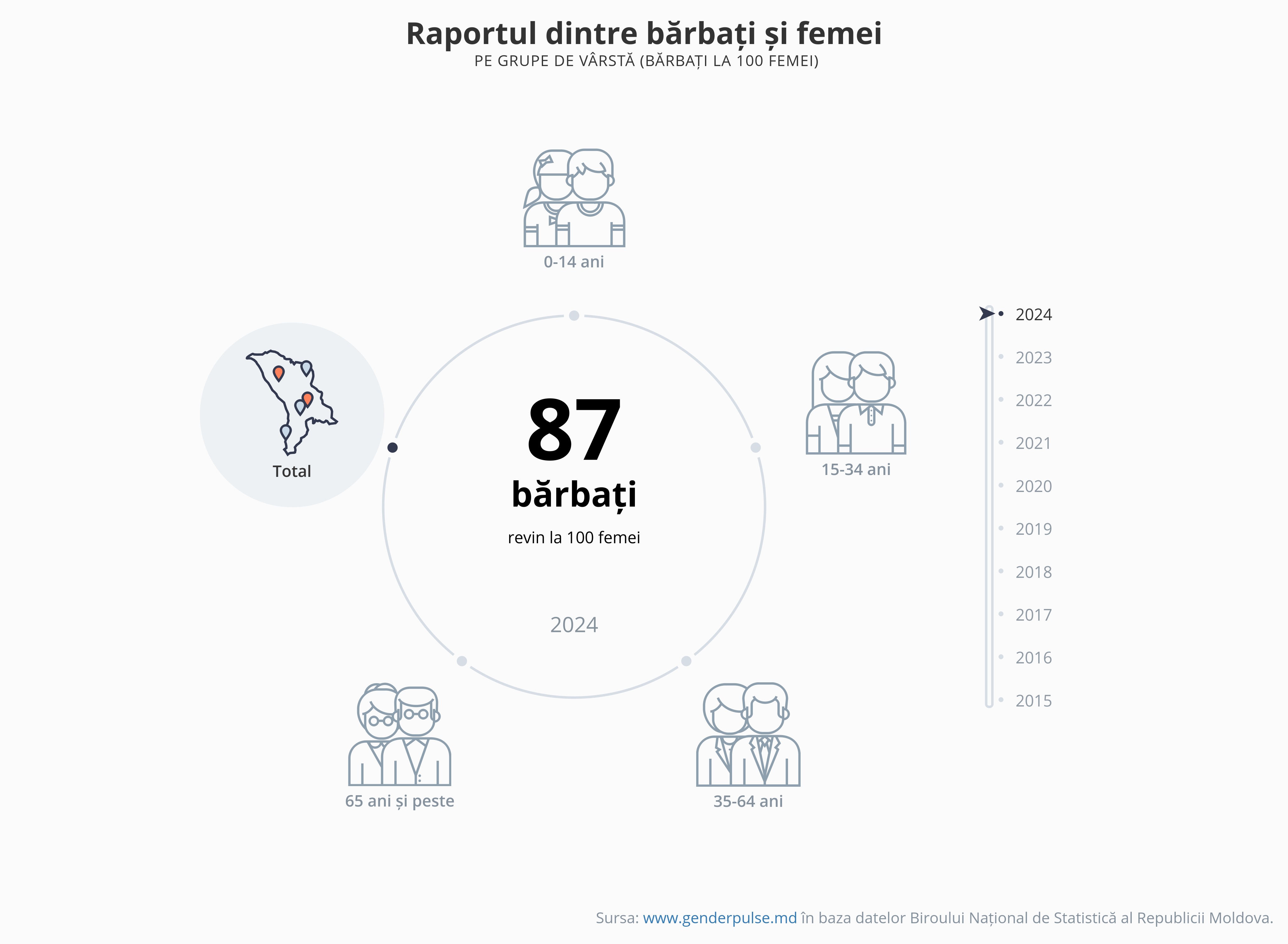 Raportul dintre bărbați și femeipe grupe de vârstă (bărbați la 100 femei)