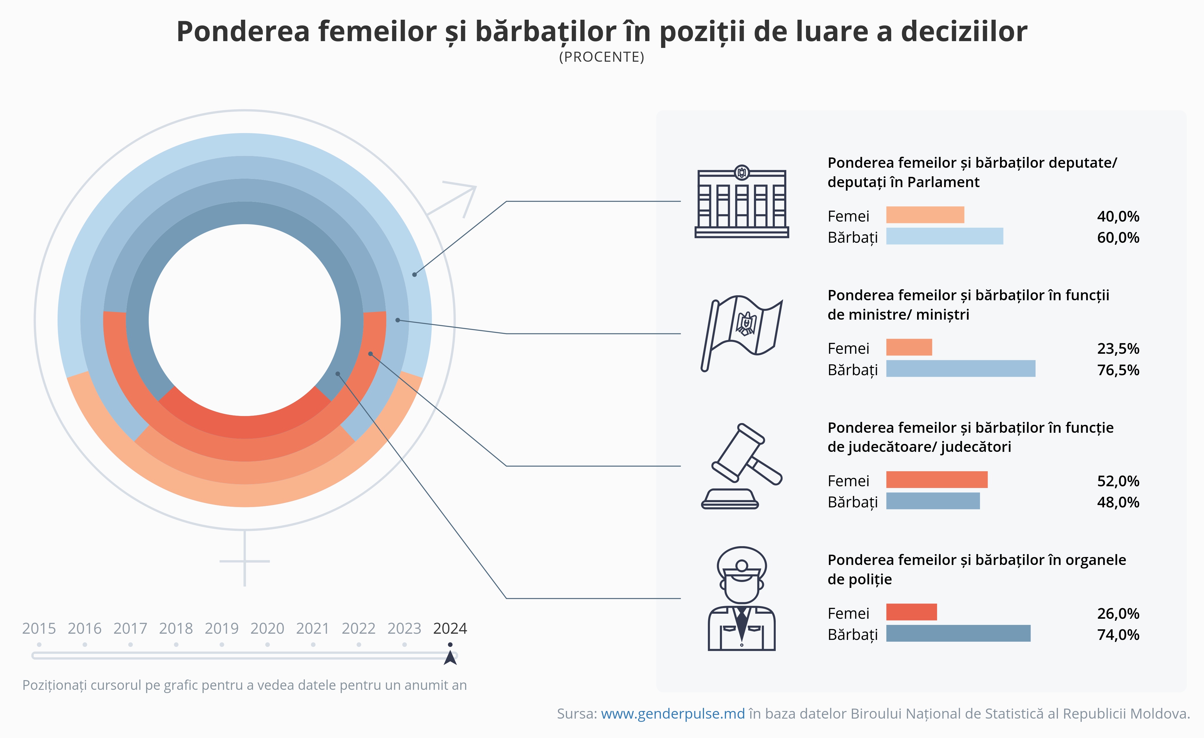 Ponderea femeilor și bărbaților în poziții de luare a deciziilor(procente)
